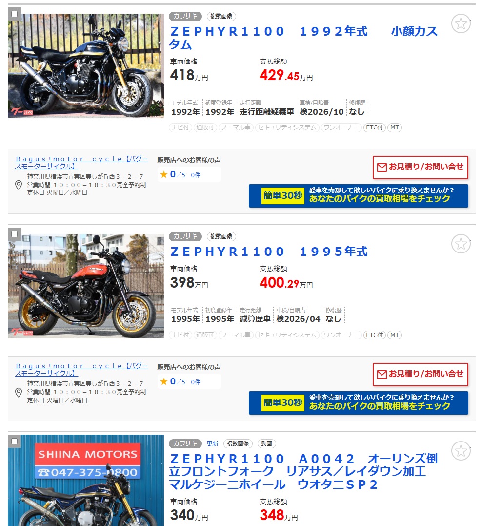 大型のゼファーとなる「ゼファー1100」は、以下の画像のように高いものでは300万円~400万円で販売されている車両も見られます。