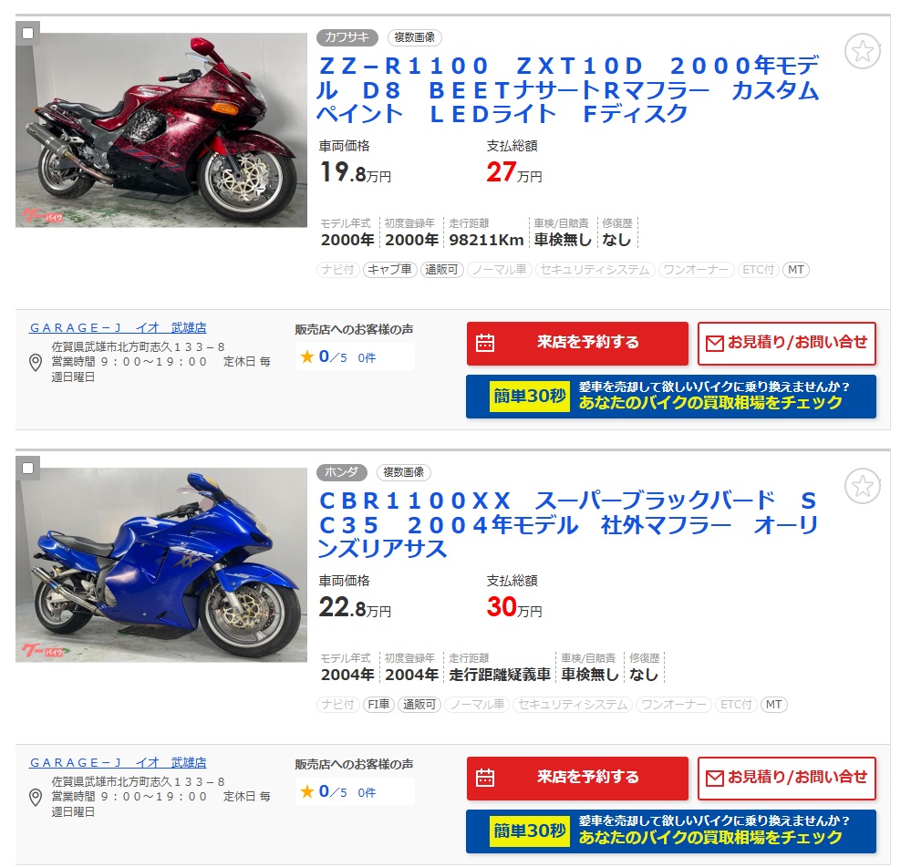 たとえば以下の画像のような「カワサキ・ZZ-R1100」「ホンダ・CBR1100XX」といった2000年前後に販売されていたモデルの場合、中古で20万円弱で販売されている車種も多いです。