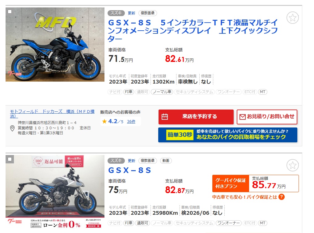 たとえば、スズキが販売する大型バイク「GSX-8S」は、新車価格は1,122,000円(2025年3月現在)となりますが、中古では以下の画像のように、安いものでは70万円弱で購入できる車両が流通しています。
