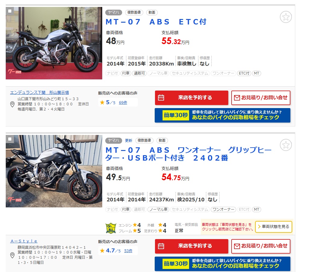 例えば不人気車と言われることの多い「ヤマハ・MT-07」は、2014年前後に販売されたまだそれほど古くないモデルでも50万円前後で購入できます。