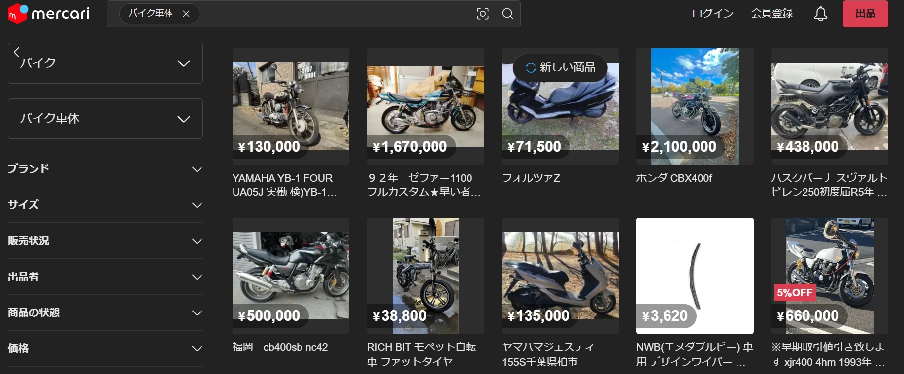 『メルカリ』や『ジモティー』といったフリマサイトでも、原付から大型まで、さまざまなバイクが販売されています。フリマサイトは個人間売買となるためバイク店より安くなるケースが多く、時には市場価格を大きく逸脱した破格で手に入ることもありますので、こうしたサイトも併せてチェックしておきたいところです。